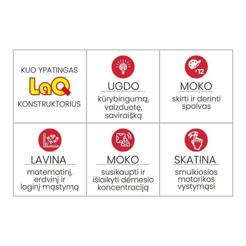 LaQ detalės yra daugkartinio naudojimo, iš rinkinio detalių galima perkonstruoti 46 skirtingus modelius.