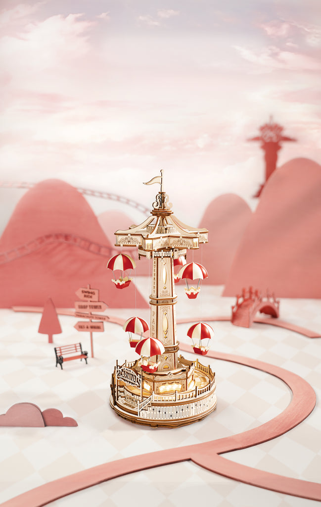 3D Medinis konstruktorius „Parašiutų karuselė“ yra kūrybiškas ir linksmas 3D medinis dėlionės rinkinys iš serijos „Magic Amusement Park“. Jo dizainą įkvėpė pramogų parko sūpynės. Paspaudus mygtuką karusėlė pradės suktis kartu su muzika ir šviesomis, o parašiutai kils aukštyn ir leisis žemyn.