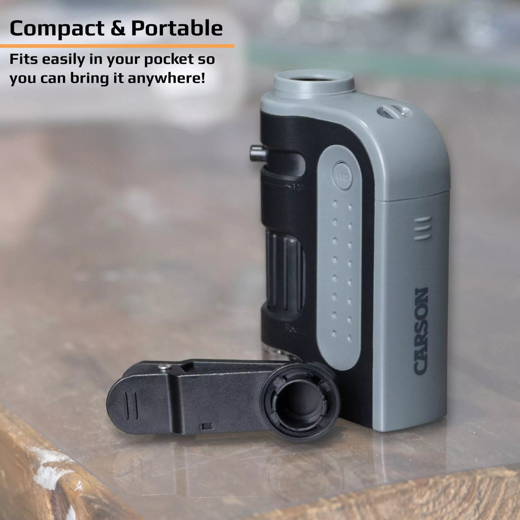 „Carson MicroBrite Pro“ kišeninis mikroskopas su LED apšvietimu itin lengvas ir kompaktiškas. Pagamintas su tiksliai suformuotais asferiniais lęšiais, užtikrinančiais aukščiausios kokybės optiką su 60x-120x didinimu ir ryškiu, aiškiu matymu.