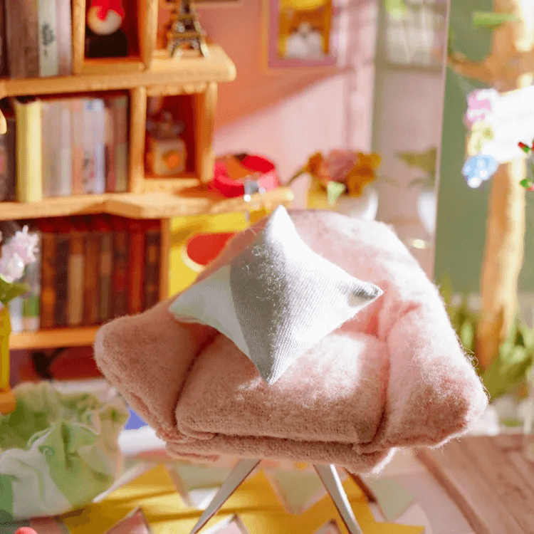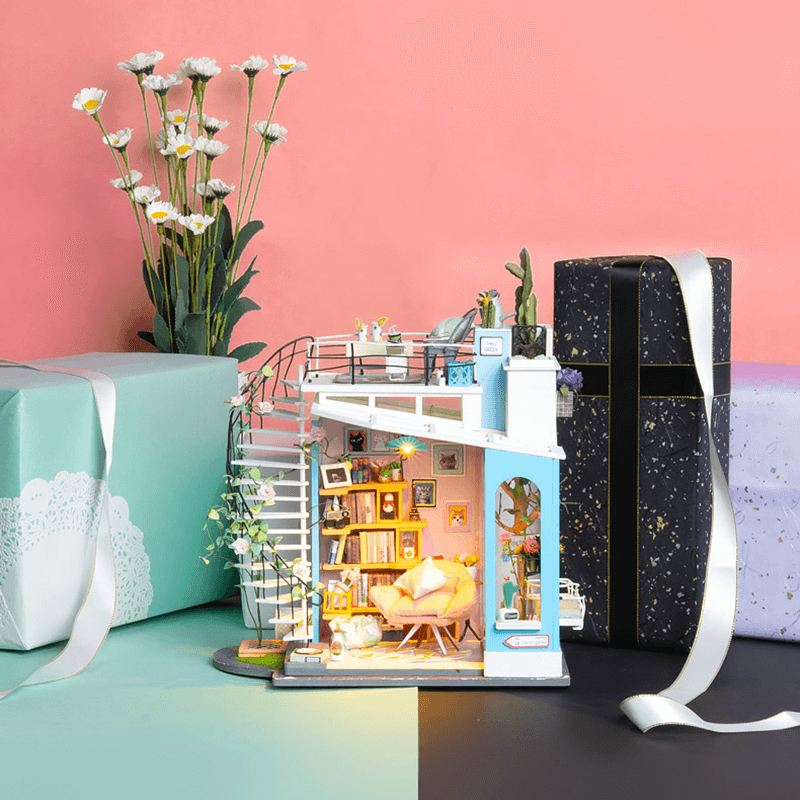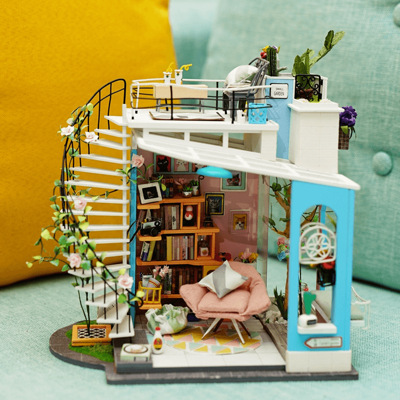 Rolife Dora Loft DIY komplekt on moodne duplekskorter. See on kujundatud pehmetes ja värsketes toonides nagu roosa, sinine ja valge. Saate luua palju kauneid detaile, nagu lilled, ronitaimed, keerdtrepp, hubane diivaninurk ja raamaturiiul.