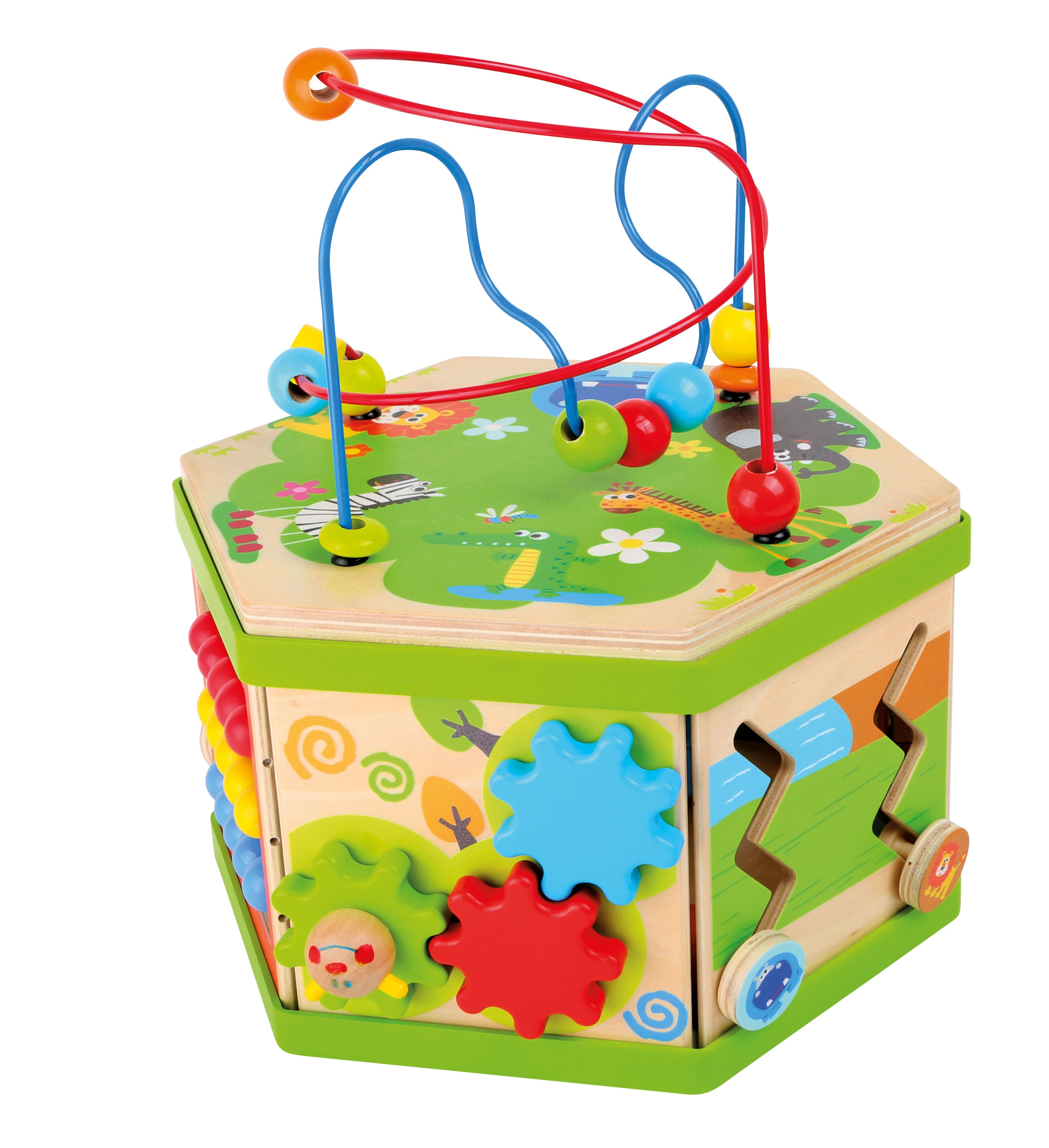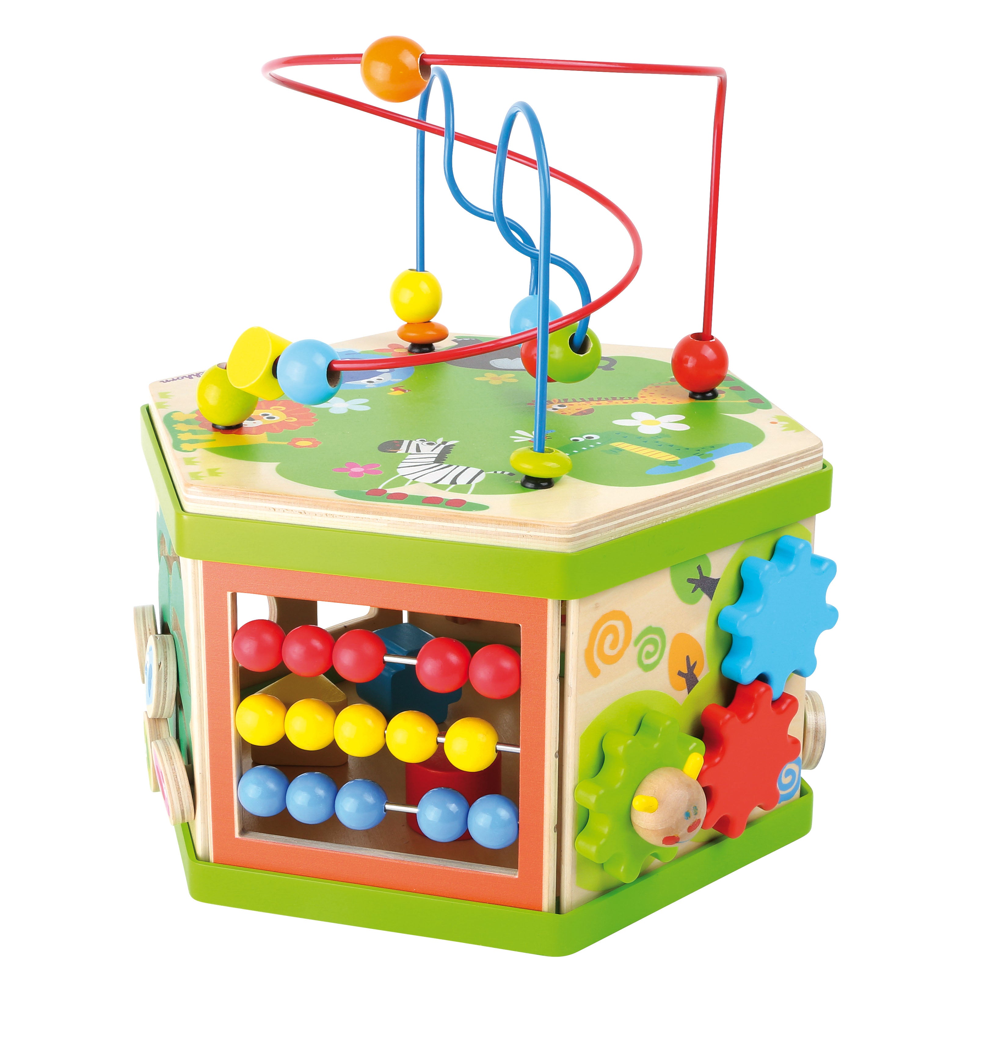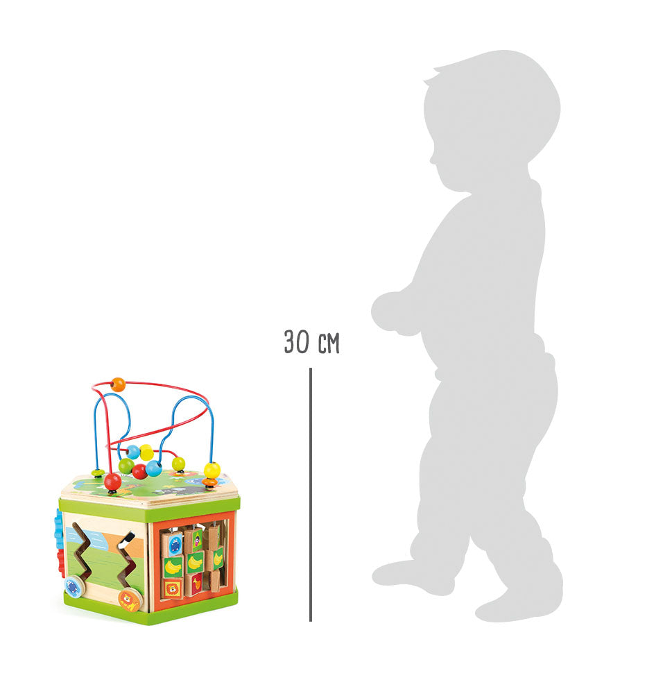 Motorinių įgūdžių lavinimo kubas, pagamintas iš tvirto medžio su linksmais gyvūnų motyvais.
