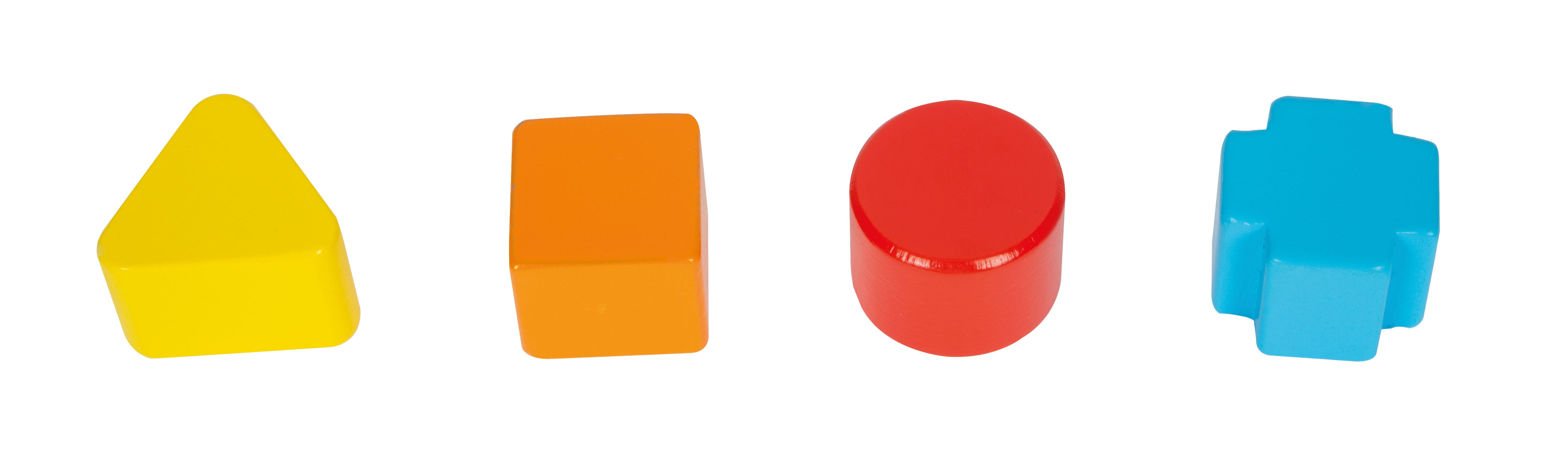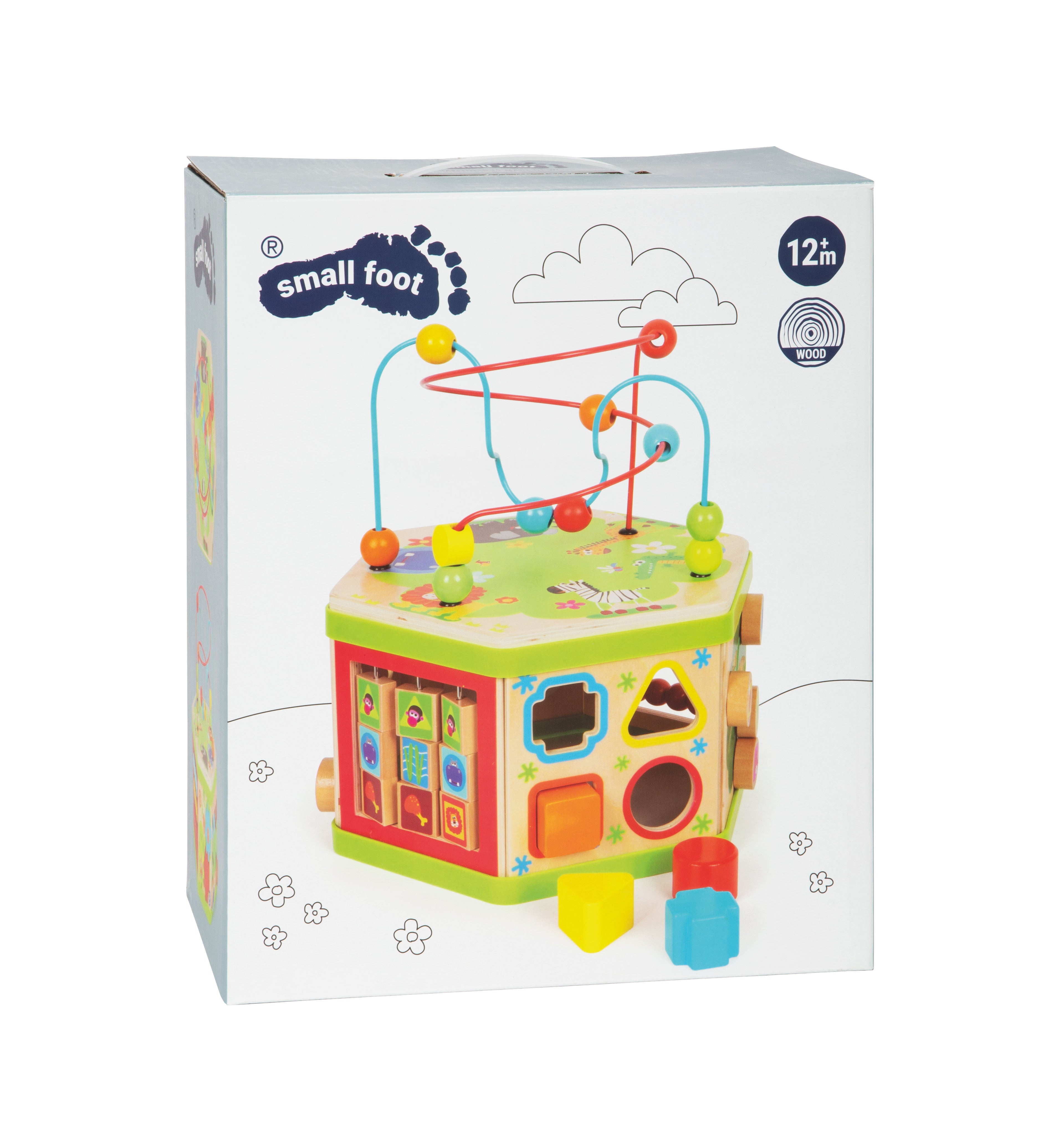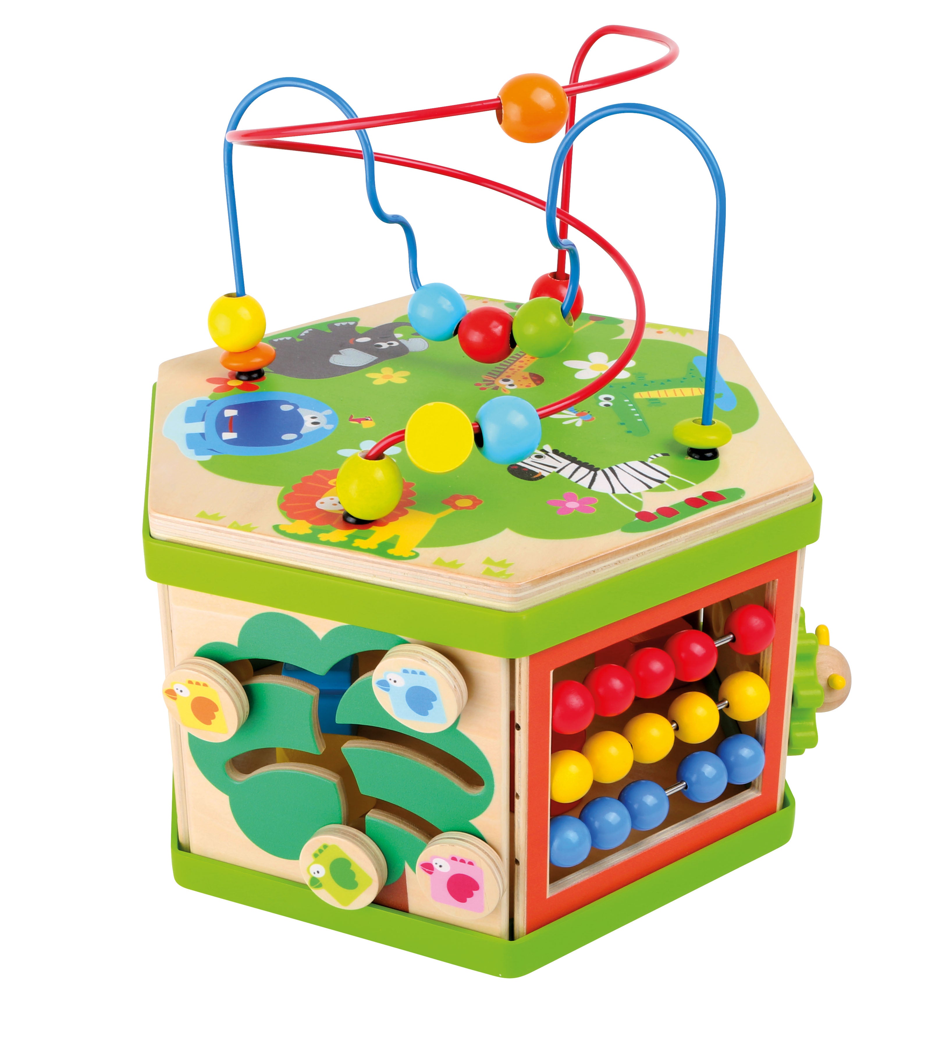 Motorinių įgūdžių lavinimo kubas, pagamintas iš tvirto medžio su linksmais gyvūnų motyvais.