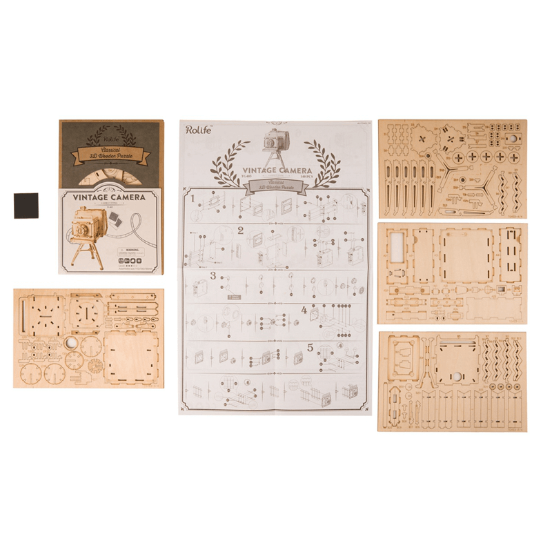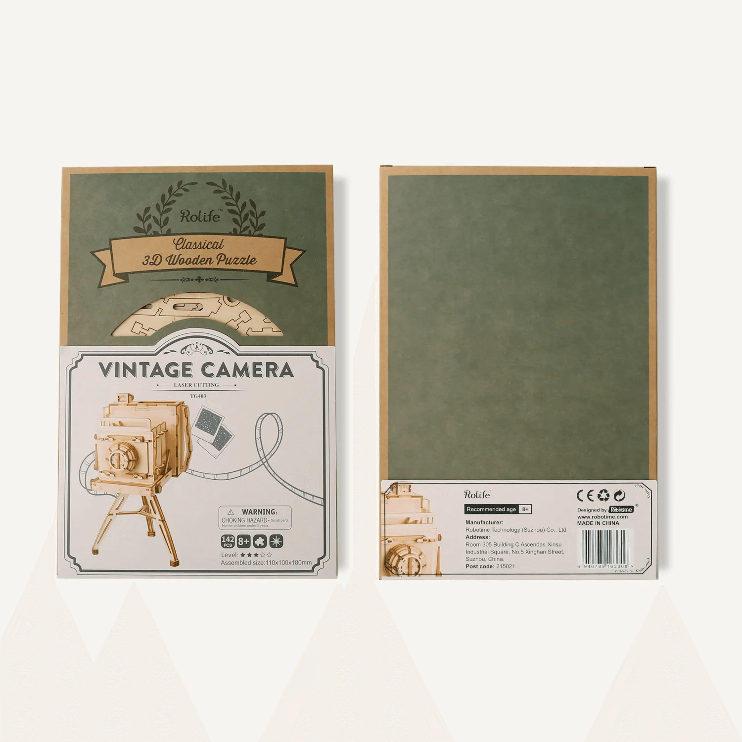 Robotime - Rolife Vintage Camera ir unikāls un burvīgs 3D koka konstruktors, kas ļauj izveidot miniatūru retro stila kameru. Šis konstruktors izceļas ar augstas kvalitātes koka detaļām un precīzi izgrieztām detaļām, tāpēc saliktā veidā tas izskatās ļoti reālistiski. Modelis, kas veidots kā lieliska dāvana fotogrāfijas entuziastiem un rokdarbu cienītājiem, lieliski papildinās jebkuru interjeru, kļūstot par ekskluzīvu dekoratīvu akcentu.