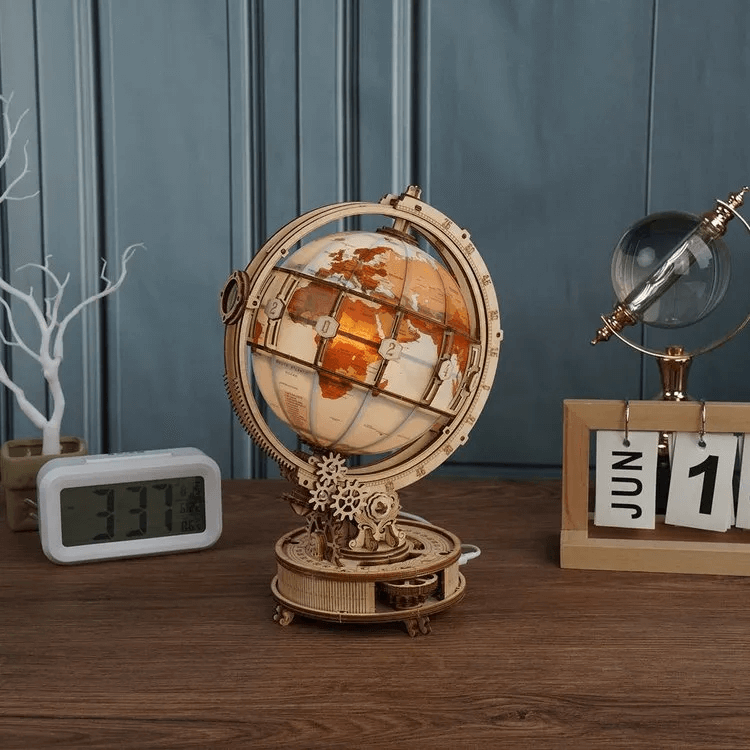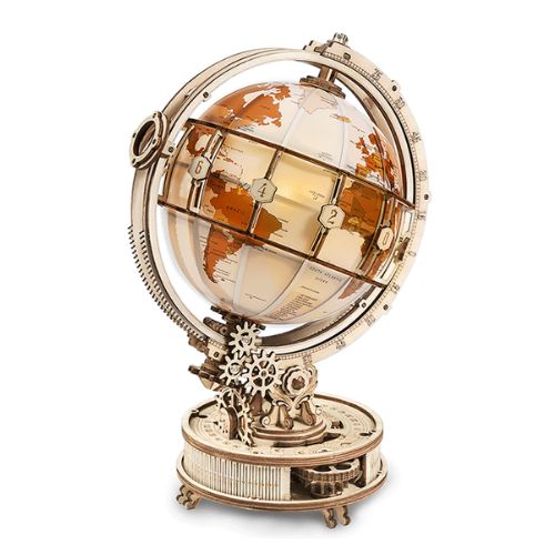 Koka 3D konstruktors "Luminous Globe" ir ne tikai ekskluzīva dekoratīva globusa klasiskā stilā, bet arī mājīga naktslampiņa, kas izstaro siltu gaismu un lieliski iederēsies guļamistabā vai bērnu istabā.