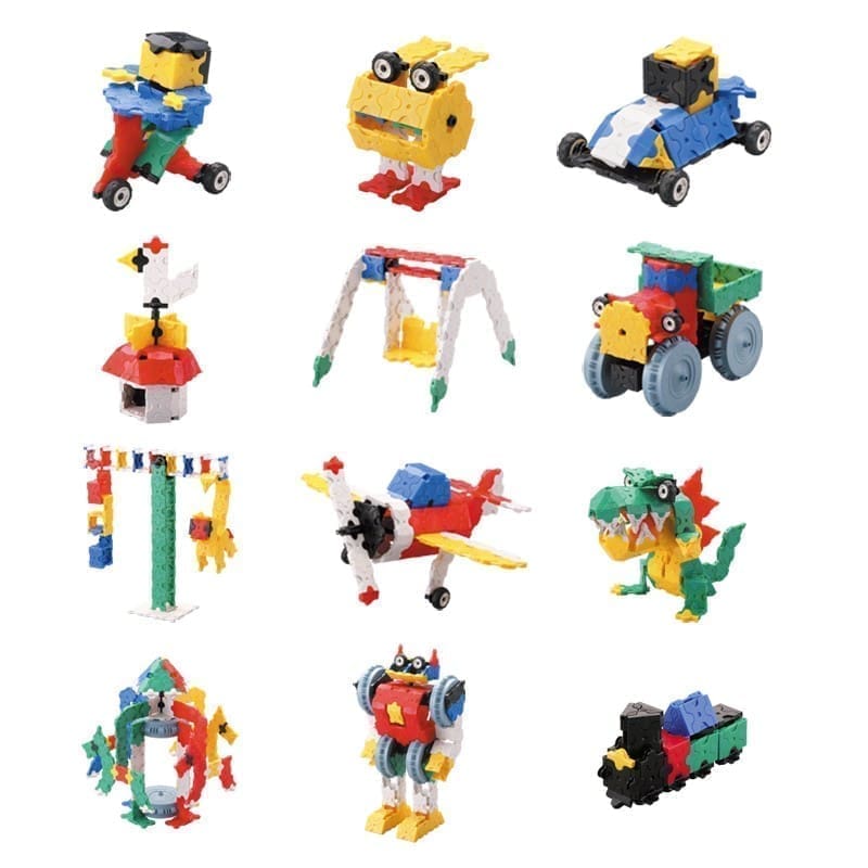 - Pagrindiniai modeliai rinkinyje: robotas, dinozauras, sunkvežimis, vandens malūnas, sūpynės ir kt.